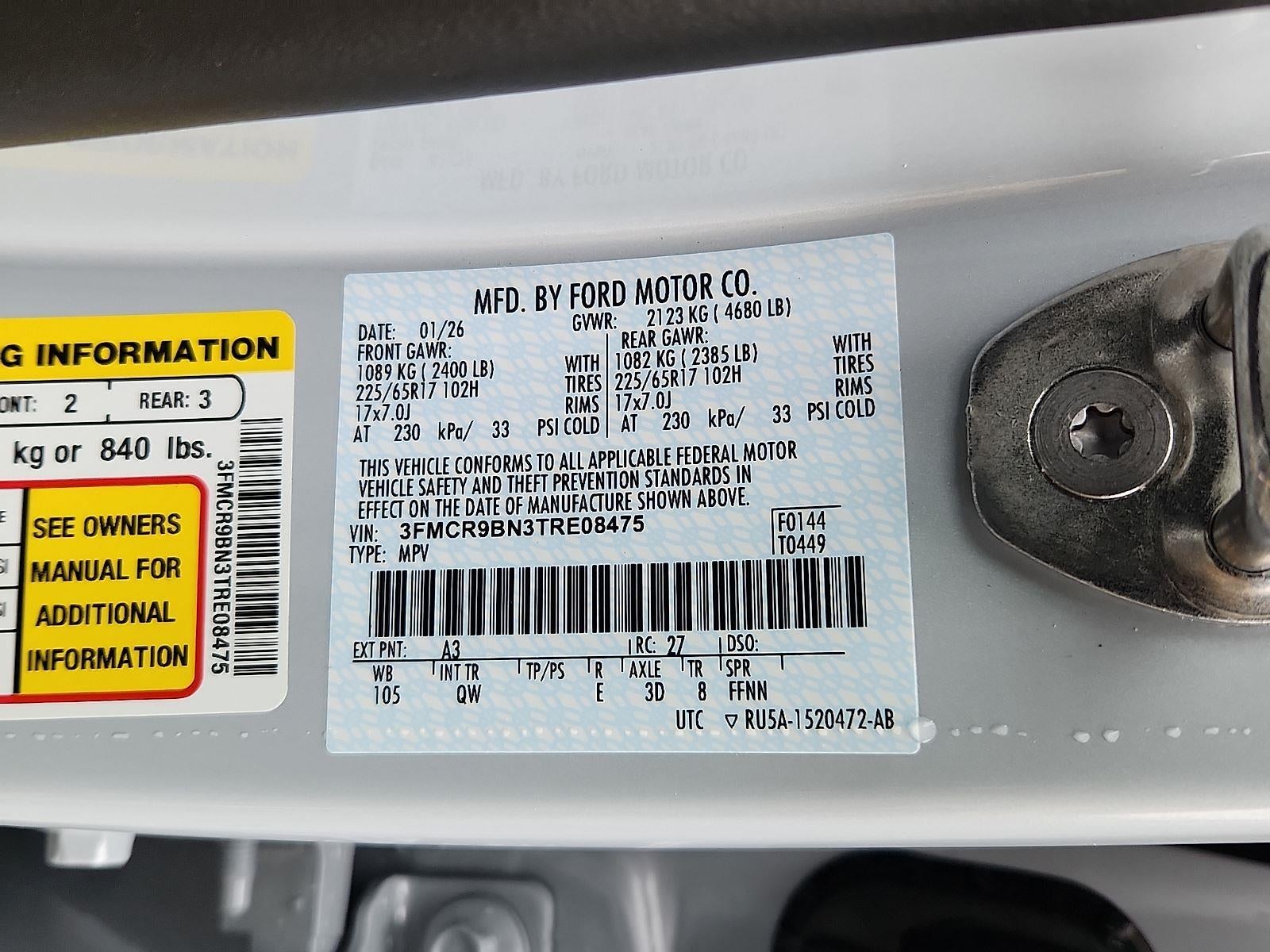 ENGINE: 1.5L ECOBOOST, TRANSMISSION: 8-SPEED AUTOMATIC, EQUIPMENT GROUP 200A STANDARD PACKAGE, SPACE WHITE METALLIC, MEDIUM LT SMOKED TRUFFLE, CLOTH W/EASY-TO-CLEAN FRONT BUCKET SEATS, CONVENIENCE PACKAGE, FRONT LICENSE PLATE BRACKET