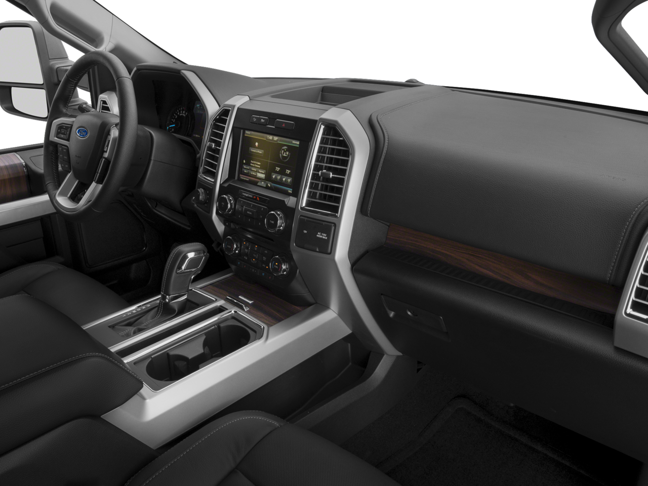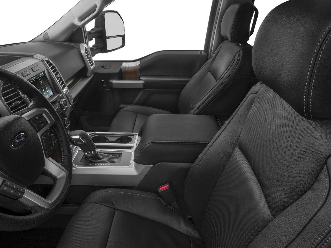 - Includes vehicle with standard equipment, BLIS (Blind Spot Information System) with Cross-Traffic Alert (BLIS sensor in LED taillamp), remote start system, remote tailgate release, reverse sensing system, quad beam LED headlamps and LED taillamps, automatic high beam lights with rain-sensing windshield wipers, LED side mirror spotlights, power folding, power glass side view mirrors with heat, turn signals, memory, auto-dimming feature on drivers side, high-intensity LED security approach lamps, one 110V/400W outlet (two with bucket seats), universal garage door opener, power tilt and telescoping steering column with memory, heated steering wheel, heated and cooled leather-trimmed bucket seats, 10-way power driver and passenger seats, memory driver seat, heated second row seats, flow-through console with floor shift, Sony single-CD player, HD radio, SYNC Connect, SiriusXM Satellite Radio, voice-activated navigation with SiriusXM Traffic and Travel Link with five years of service in the 48 contiguous United States and D.C., and Lariat Chrome Appearance Package including 18 inch chrome-like PVD wheels, 275/65R18 OWL all-terrain tires, chrome angular step bars, chrome door handles with body-color bezel, two chrome front tow hooks, chrome single-tip exhaust, chrome skull caps on exterior mirrors, and chrome three-bar style grille with chrome surround and chrome mesh insert. When Two-Tone Paint is selected, front and rear chrome bumpers are replaced with front and rear accent-color bumpers, and standard body-color wheel lip moldings are replaced with accent-color wheel lip moldings.